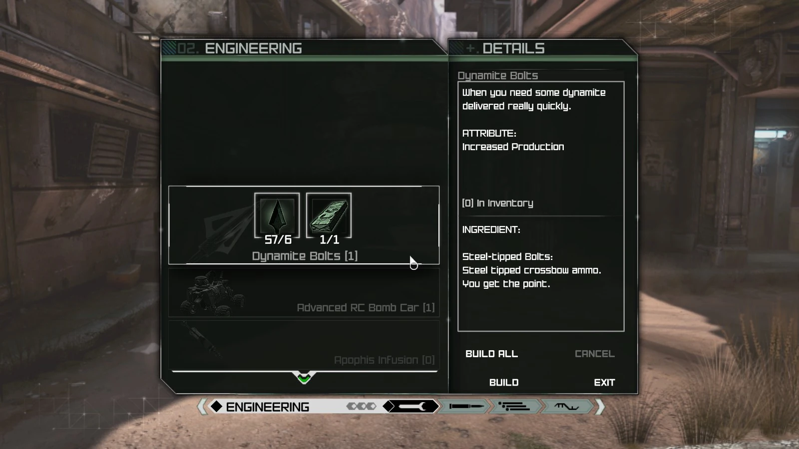 The Dynamite Bolts are an ammunition type and an engineering item featured in RAGE. They are used with the Striker Crossbow. These bolts are created via the corresponding schematic and also found in a few locations throughout the Wasteland.
