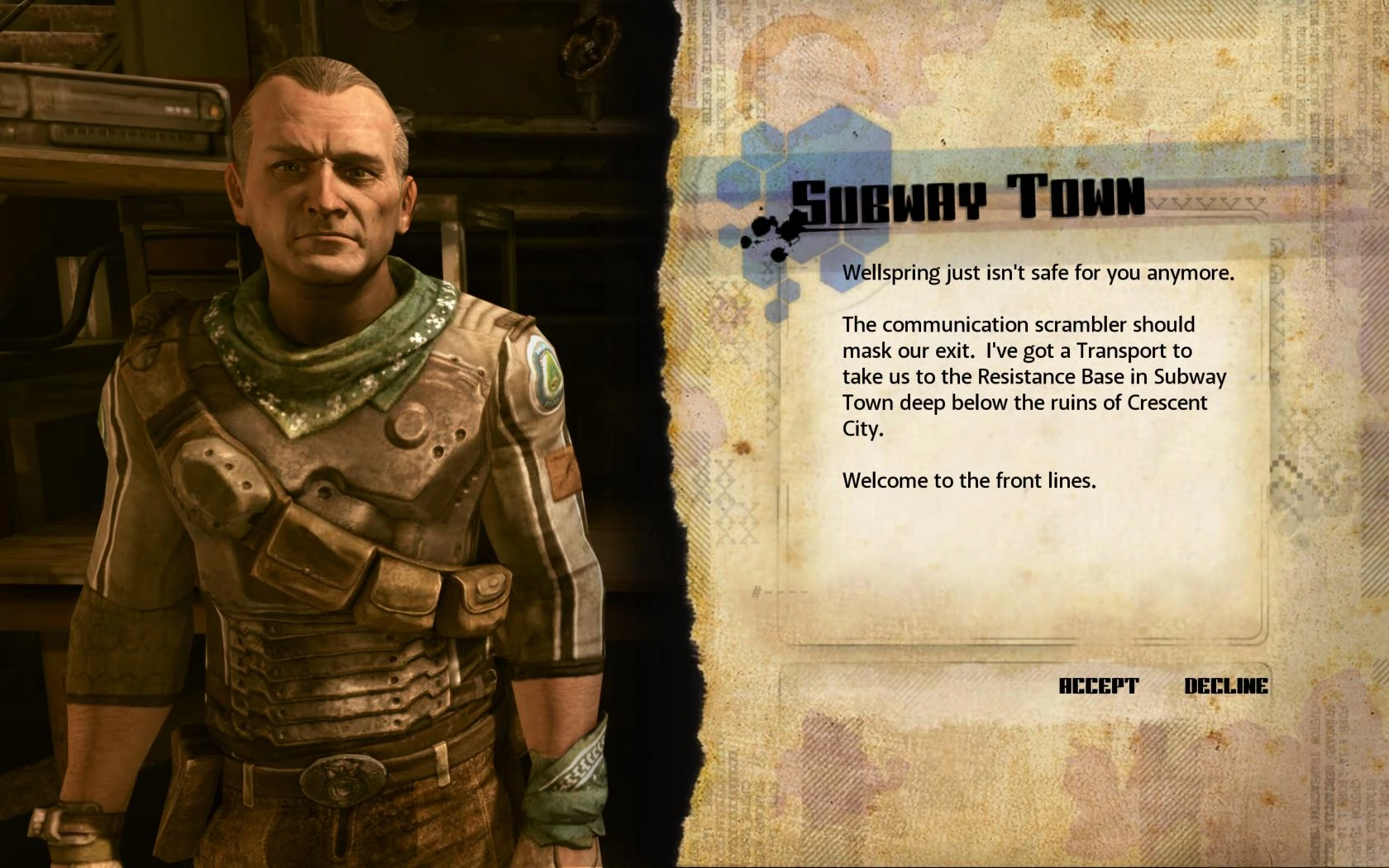 - The communication scrambler should mask our exit. I've got a Transport to take us to the Resistance Base in Subway Town, deep below the ruins of Crescent City.