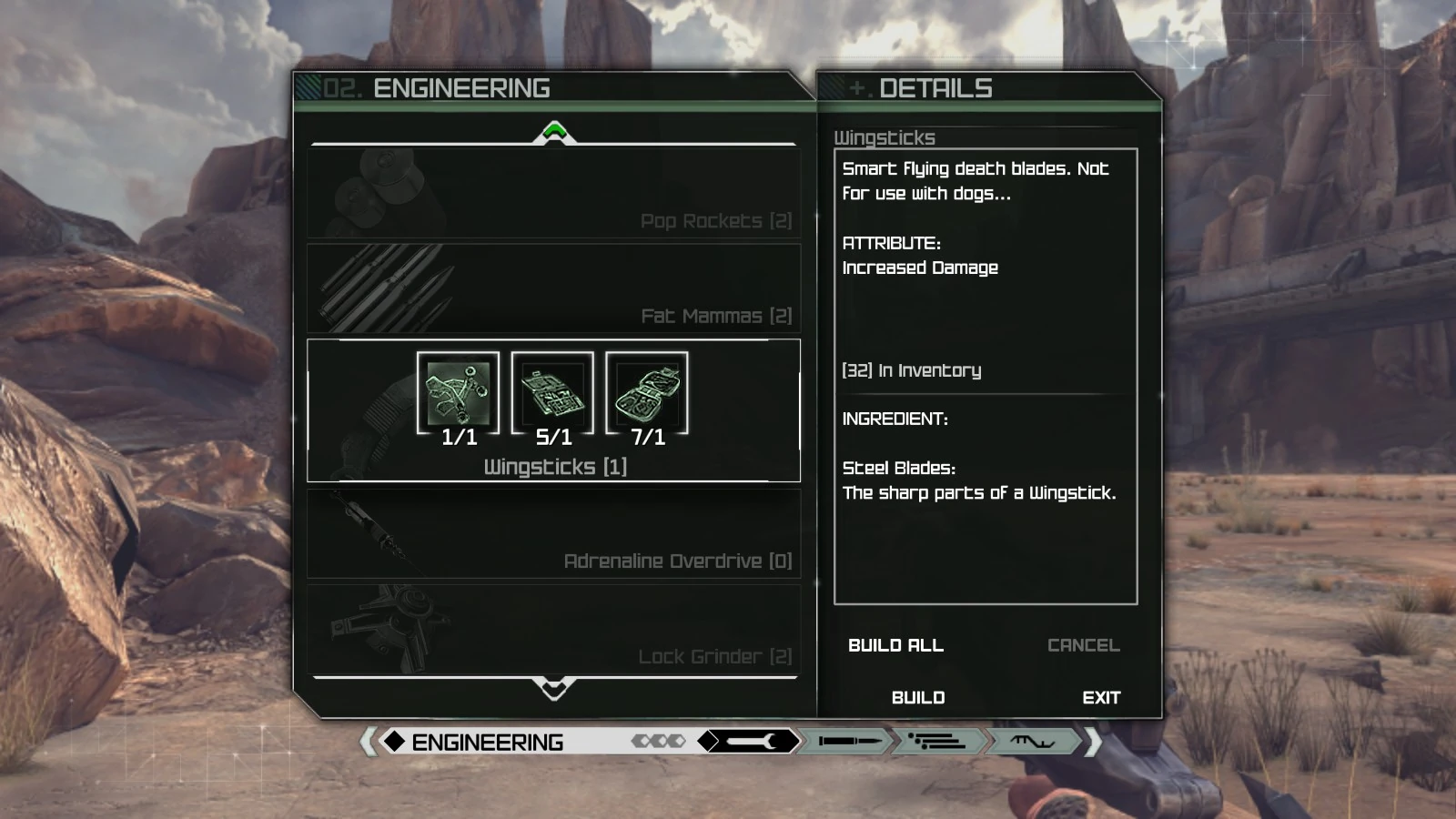 It is advisable for the players who like using Wingsticks to purchase the corresponding schematic from "Jani's Supplies" immediately after it becomes available, because the upgrade is well worth the money spent. Note that upon purchasing the upgrade all regular Wingsticks in the inventory will be converted to the advanced tier.